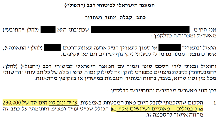 230,000 ש"ח לרוכב אופנוע שנפגע בתאונת דרכים בעת שירד מהאופנוע בסיום הנסיעה ושבר את רגלו. תאונה בעת "כניסה" לרכב/אופנוע או "ירידה" ממנו עלולה להיות מוכרת כ"תאונת דרכים" כאשר הכניסה היא לצורך "נסיעה" (או לצורך פעולה אחרת הבאה בגדר "שימוש ברכב מנועי" כהגדרתה בחוק הפיצויים לנפגעי תאונות דרכים), או כאשר הירידה היא לצורך יציאה מהרכב/האופנוע בתום ה"נסיעה".